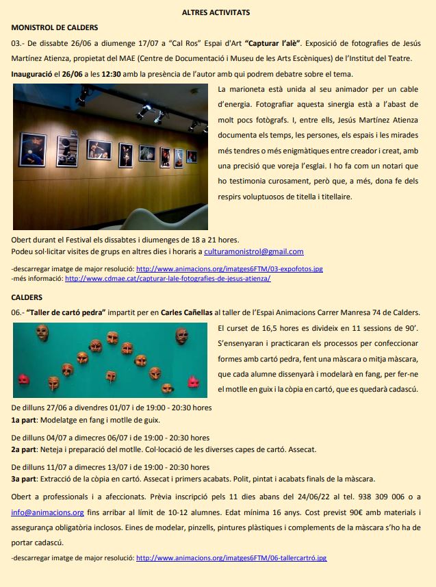Arts Santa Mònica Associació Titellaire de Roquetes Barcelona Born Casa-Taller de Marionetas de Pepe Otal Catalunya Centre de Titelles de Lleida Cesc Martínez Cursos Damià Barbany Editorial Eudald Ferré Festival Internacional de Teatre de Teresetes fil Fira de Teatre de Titelles de Lleida Fira de Titelles de Lleida guant if barcelona Institut del Teatre Institut del Teatre de Barcelona Joan Baixas Jordi Bertran La Puntual La Revolta dels Titelles Lleida MAE Mallorca Néstor Navarro Objectes Ombres Palma Palma de Mallorca Poble Espanyol Putxinel·li Rocamora Teatre Sala Fènix teatre d'objectes Teatre d'Ombres Teia Moner Teresetes titelles Toni Rumbau Unima UNIMA Catalunya València