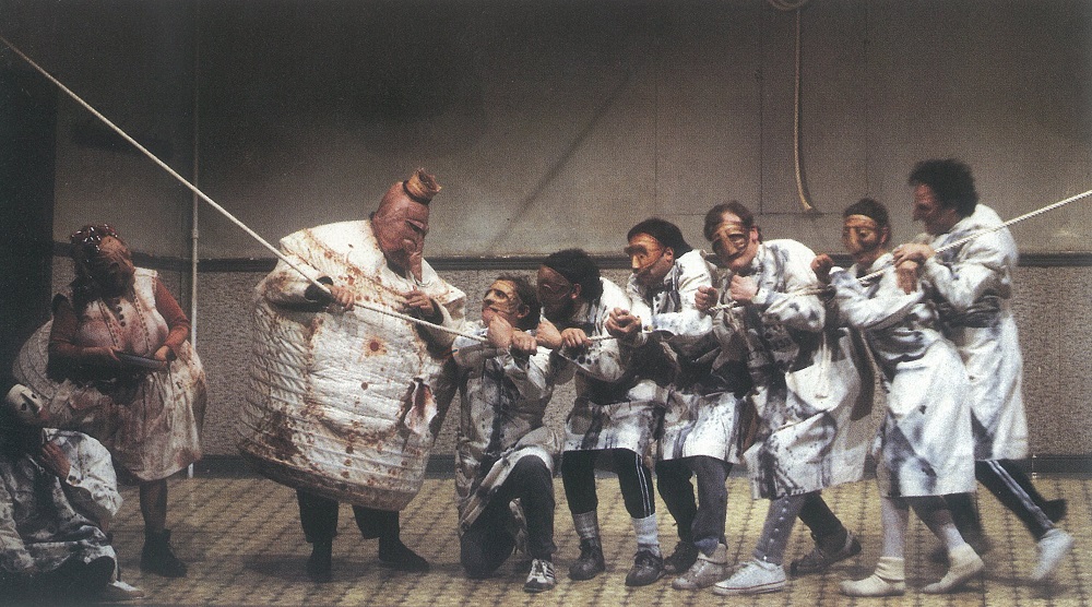 La imatge precedent ens mostra com la formalització dels personatges del Pare i la Mare Ubú, tot i ser interpretats per un actor i una actriu, s’inscriuen en una estètica explícitament titellaire materialitzada pels magnífics vestuaris i màscares dissenyats per Fabià Puigserver.