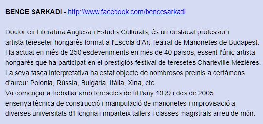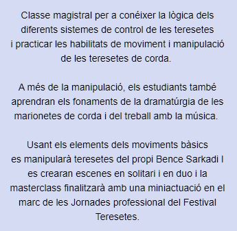 S’acosta el Festival Internacional de Teatre de Teresetes de Mallorca, que tindrà lloc del 19 al 21 de maig de 2023. I com cada anya, el festival ofereix un curs especialitzat, en aquest cas de manipulació de teresetes de fil a càrrec del famós marionetista hongarès Bence Sarkadi. La masterclass comença el dilluns 16 de maig i s’acaba el dijous 19 de maig.