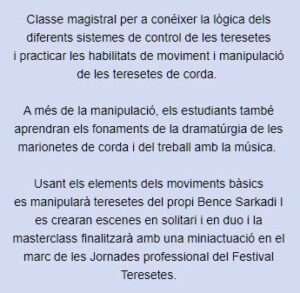 Arts Santa Mònica Associació Titellaire de Roquetes Barcelona Born Casa-Taller de Marionetas de Pepe Otal Catalunya Centre de Titelles de Lleida Cesc Martínez Cursos Damià Barbany Editorial Eudald Ferré Festival Internacional de Teatre de Teresetes fil Fira de Teatre de Titelles de Lleida Fira de Titelles de Lleida guant if barcelona Institut del Teatre Institut del Teatre de Barcelona Joan Baixas Jordi Bertran La Puntual La Revolta dels Titelles Lleida MAE Mallorca Néstor Navarro Objectes Ombres Palma Palma de Mallorca Poble Espanyol Putxinel·li Rocamora Teatre Sala Fènix teatre d'objectes Teatre d'Ombres Teia Moner Teresetes titelles Toni Rumbau Unima UNIMA Catalunya València