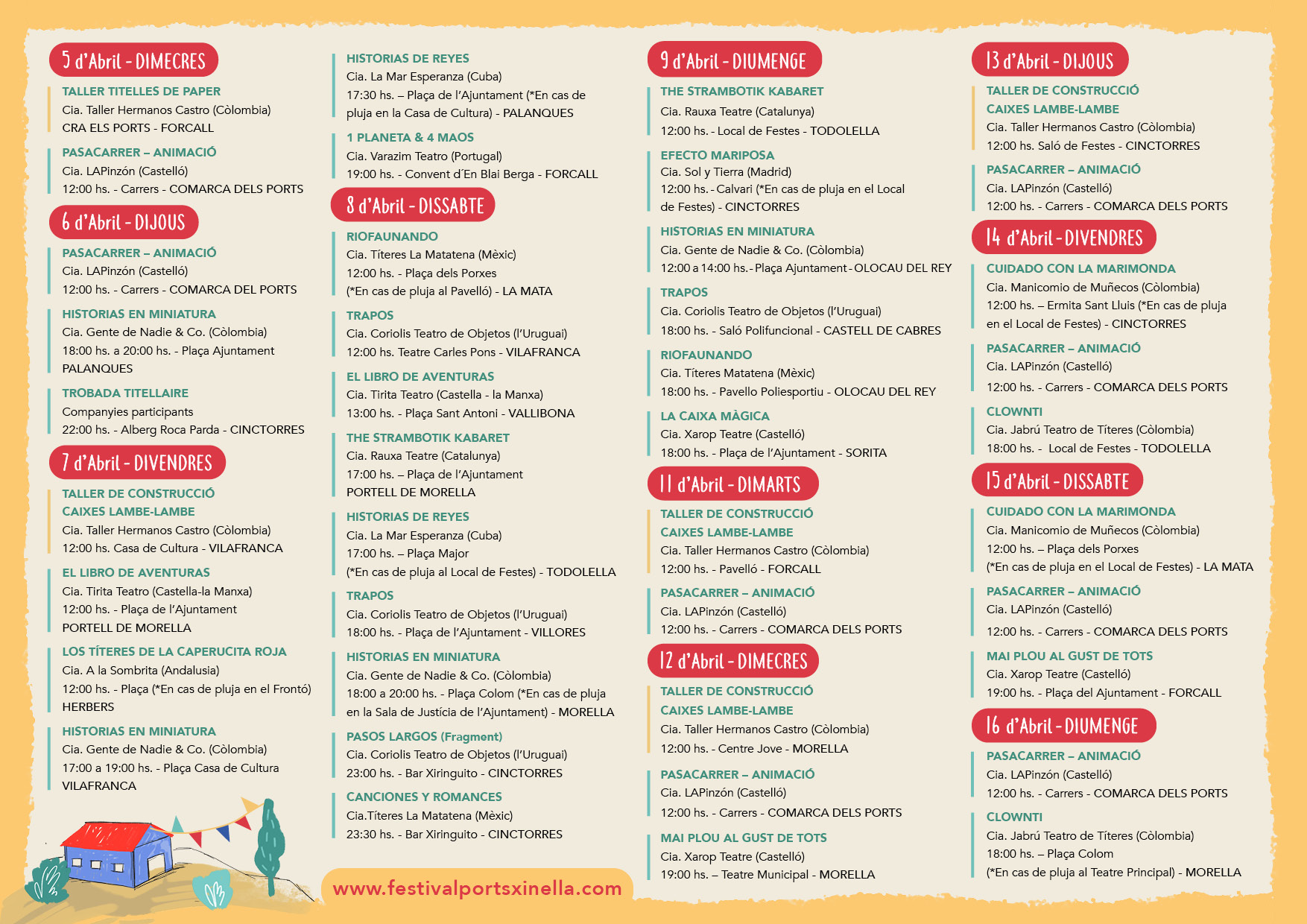 En aquest calendari hi podeu trobar properes activitats organitzades pels associats de Titeresante.es, Putxinelli.cat o Puppetring.com.