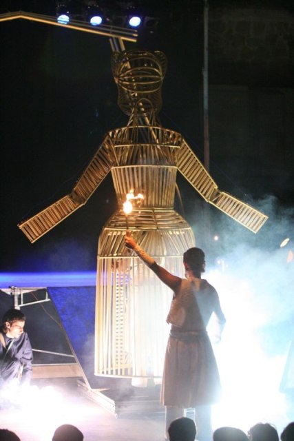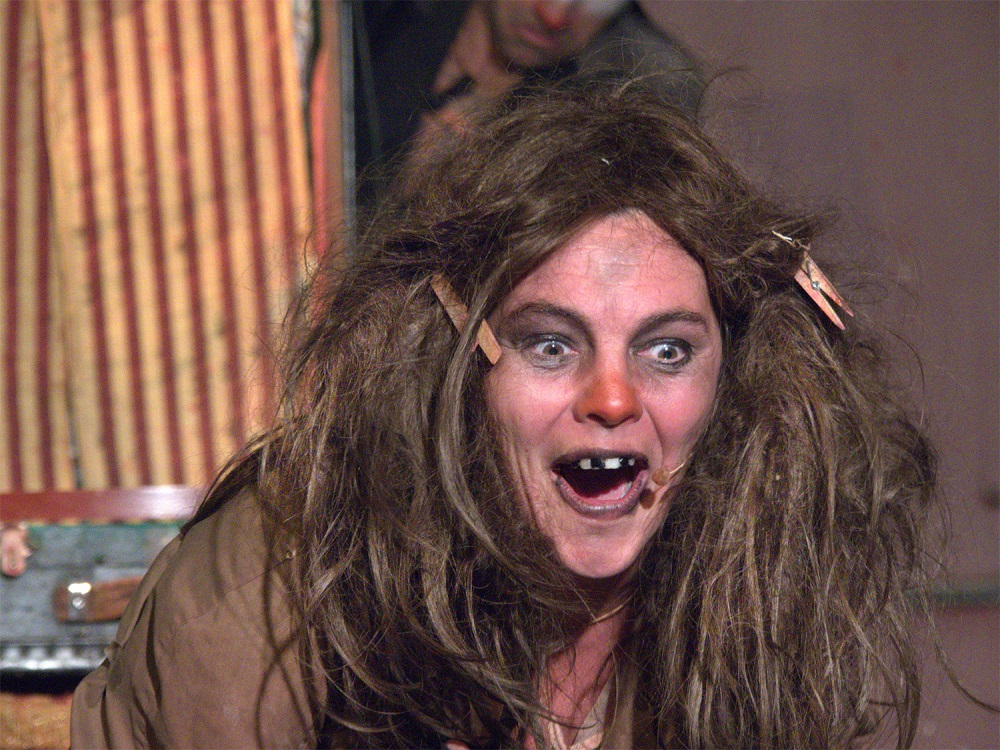 La transformació de l’actriu Angela Neiman és espectacular, amb una caracterització i un vestuari impressionants, tot conjugat amb la pròpia plàstica de l’escenari, dels titelles, de la roulotte que fa d’escenografia de fons, i el contrast amb el personatge de Baptiste Eliçagaray, que l’actor francès borda amb una exquisida interpretació.
