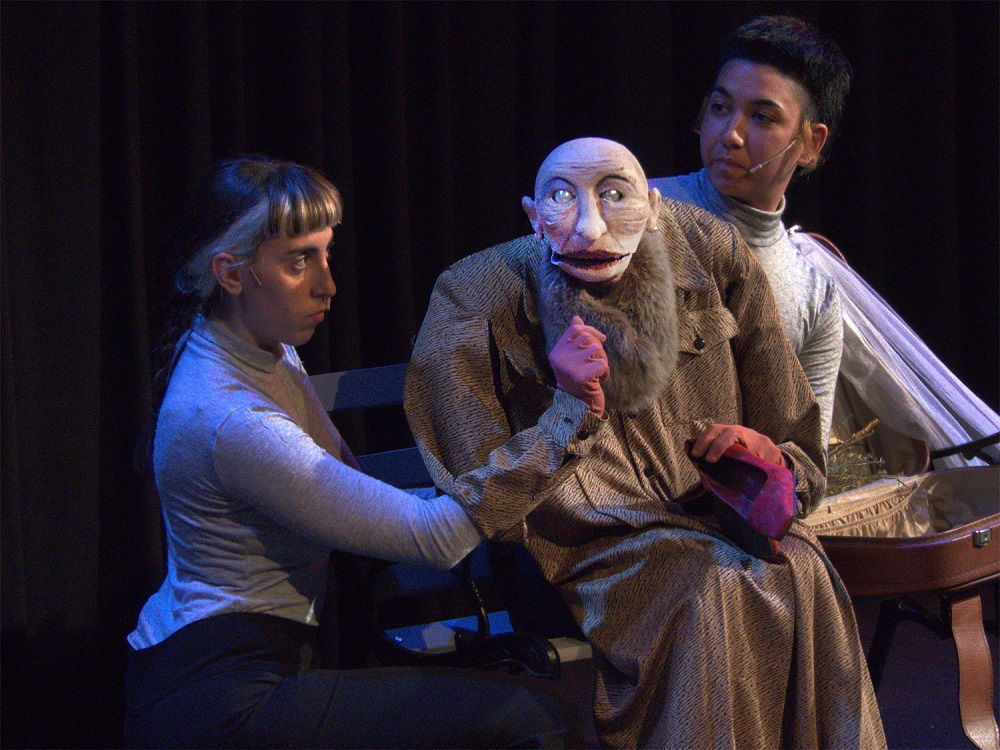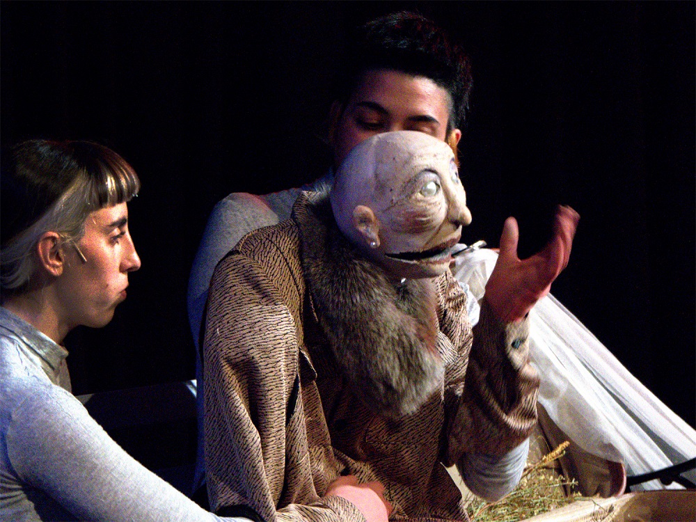 Un treball molt acurat d’un titella de boca (atenent-nos a la terminologia que utilitzen els argentins per definir aquests tipus de titelles grans que parlen obrint la boca i que ells anomenen ‘títeres de bocón’) animat per dues titellaires les quals li donen moviment i veu. Una seqüència d’interpretació que dialoga molt activament amb la música, integrada en el mateix joc escènic.