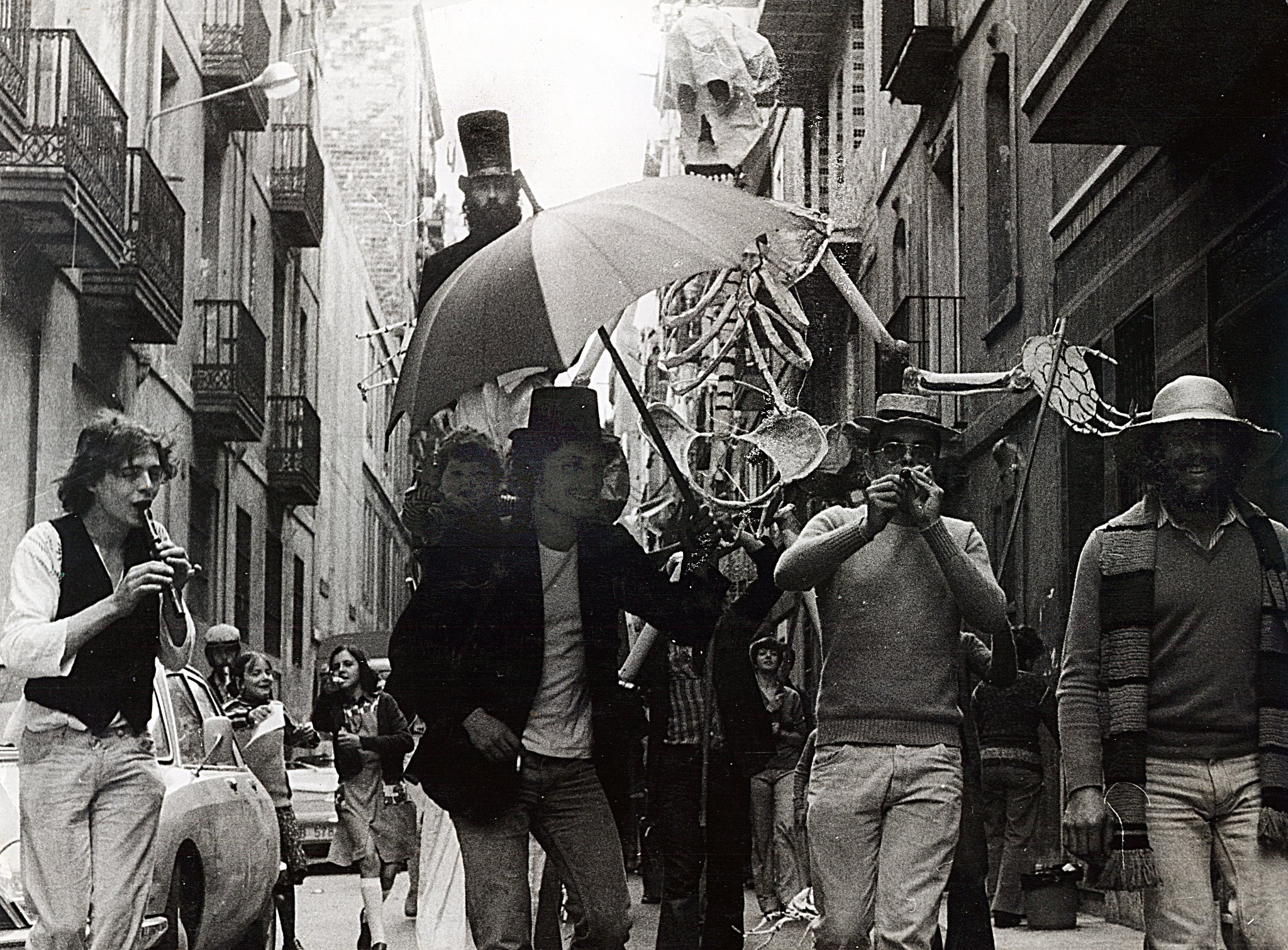 Cercavila del Grupo-Taller de Marionetas de Pepe Otal per un carrer de la Barceloneta a finals dels anys 70, amb un esquelet gegant. Pepe Otal amb xancres i un barret de copa al darrera. A l’esquerra de la imatge, un joveníssim Jordi Pinar. Amb el paraigües, l’activista llibertari de la Barceloneta Josep Romeu. Foto d’autor desconegut