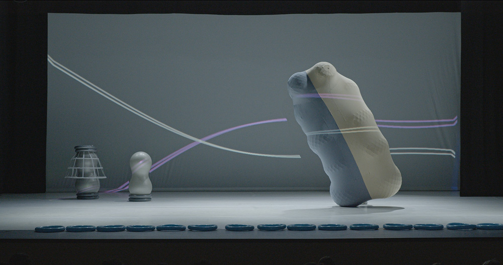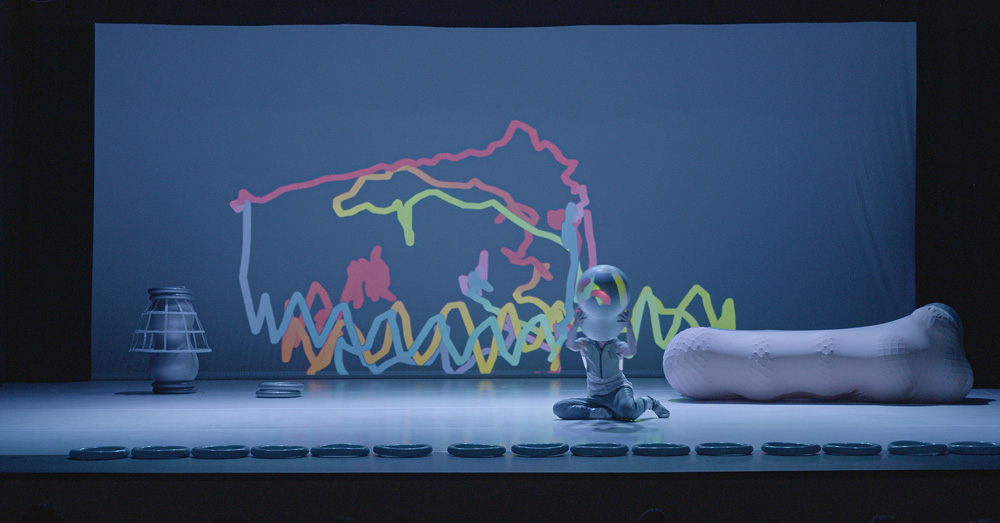 Un joc escènico-visual en el que vèiem formes evolucionar amb l’ús de projeccions i volums escampats per l’escenari, mentre la ballarina i el nen evolucionaven en aquest espai ballant, saltant, tirant-se sobre les formes, o modificant-les.