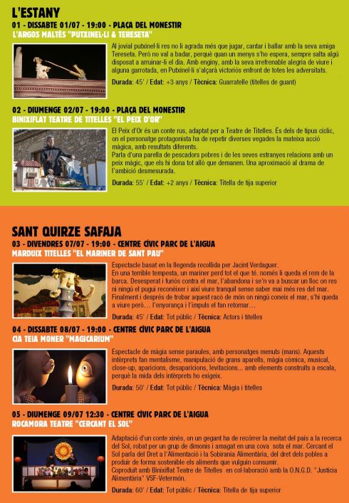 Aquest any, el programa omple tot el més de juliol de representacions que es fan a les sis següents localitats: L’Estany, Sant Quirze Safaja, Castellcir, Moià, Monistrol de Calders i Calders.