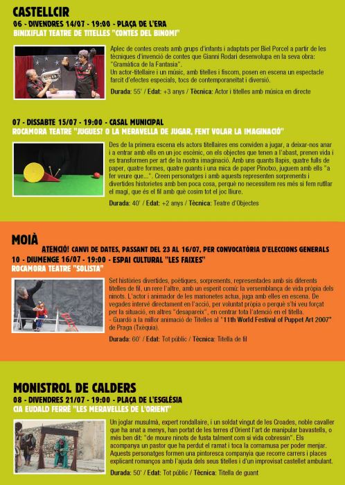 Arriba -i, per desgràcia, se’n va- el Festival de Titelles del Moianès, que des de fa 7 anys du a terme amb molts esforços i tones d’il·lusió la companyia Rocamora Teatre, des del seu Espai Animacions (Centre d’Iniciatives Titellaires) de Calders, amb Carles Cañellas i Susanna Rodríguez al capdavant.