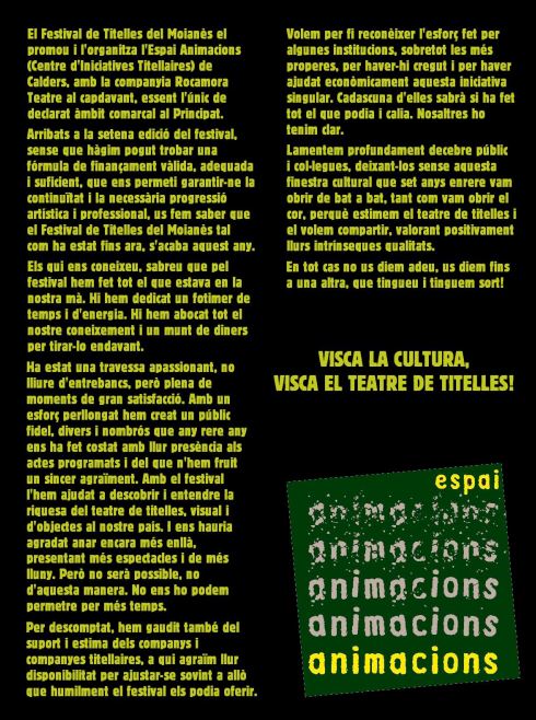 Arts Santa Mònica Associació Titellaire de Roquetes Barcelona Born Casa-Taller de Marionetas de Pepe Otal Catalunya Centre de Titelles de Lleida Cesc Martínez Cursos Damià Barbany Editorial Eudald Ferré Festival Internacional de Teatre de Teresetes fil Fira de Teatre de Titelles de Lleida Fira de Titelles de Lleida guant if barcelona Institut del Teatre Institut del Teatre de Barcelona Joan Baixas Jordi Bertran La Puntual La Revolta dels Titelles Lleida MAE Mallorca Néstor Navarro Objectes Ombres Palma Palma de Mallorca Poble Espanyol Putxinel·li Rocamora Teatre Sala Fènix teatre d'objectes Teatre d'Ombres Teia Moner Teresetes titelles Toni Rumbau Unima UNIMA Catalunya València