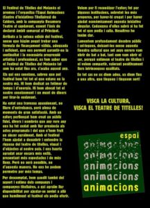 Arts Santa Mònica Associació Titellaire de Roquetes Barcelona Born Casa-Taller de Marionetas de Pepe Otal Catalunya Centre de Titelles de Lleida Cesc Martínez Cursos Damià Barbany Editorial Eudald Ferré Festival Internacional de Teatre de Teresetes fil Fira de Teatre de Titelles de Lleida Fira de Titelles de Lleida guant if barcelona Institut del Teatre Institut del Teatre de Barcelona Joan Baixas Jordi Bertran La Puntual La Revolta dels Titelles Lleida MAE Mallorca Néstor Navarro Objectes Ombres Palma Palma de Mallorca Poble Espanyol Putxinel·li Rocamora Teatre Sala Fènix teatre d'objectes Teatre d'Ombres Teia Moner Teresetes titelles Toni Rumbau Unima UNIMA Catalunya València