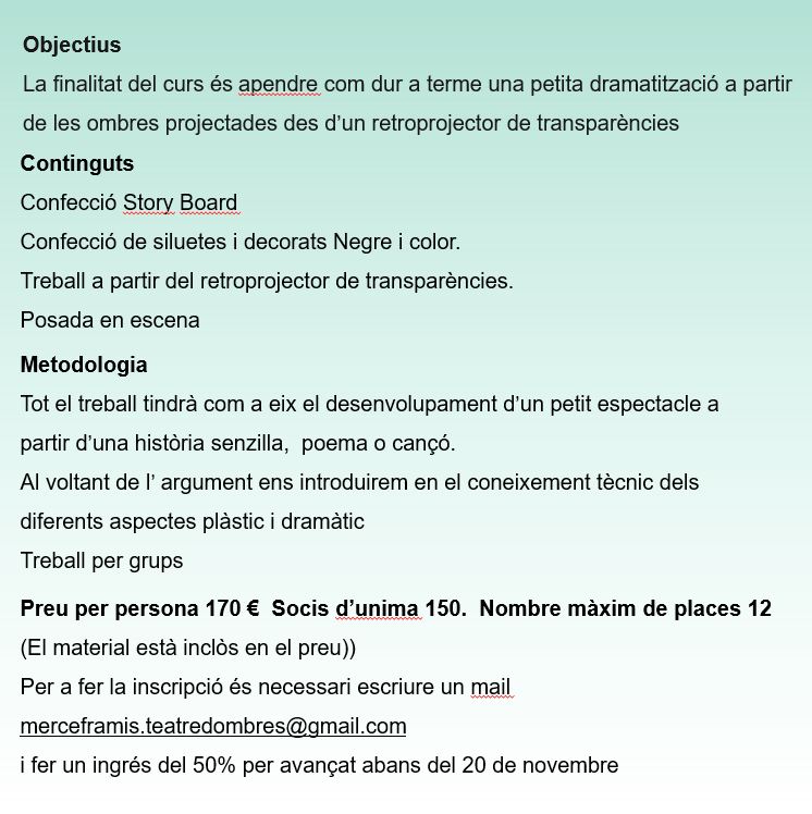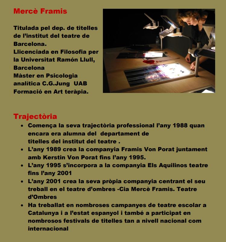 Mercè Framis, amb el suport d’Unima Catalunya, proposa un curs d’ombres amb retroprojector els dies 8, 9 i 10 de desembre de 2023 a l’Hospitalet del Llobregat, Barcelona. Una ocasió única per conèixer d’a prop el treball i les tècniques d’aquesta reconeguda mestre del teatre d’ombres.