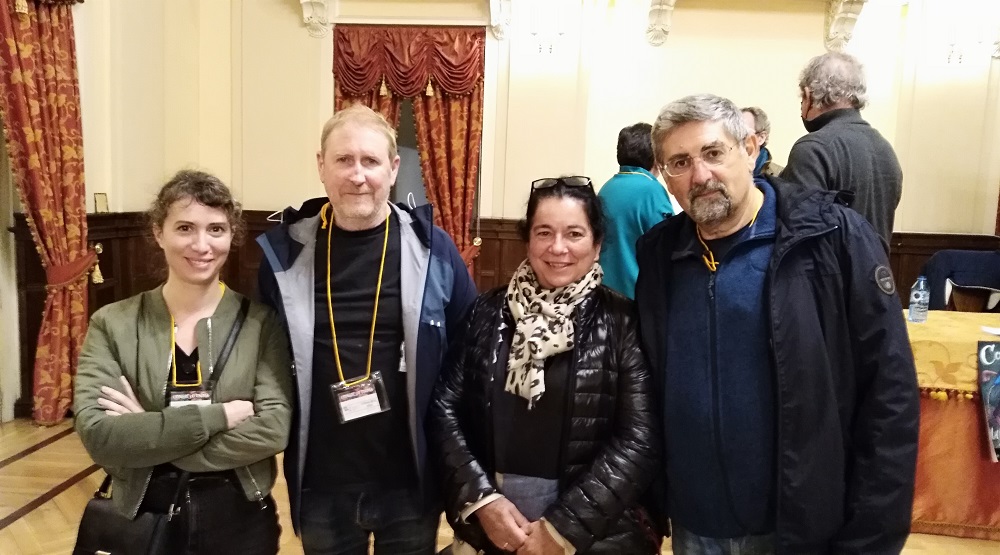 Claire Duchez, representante de Unima Francia-Themaa, Pablo Girón, secretario de Unima Federación Esaña, Eva Serna, presidenta de Unima Fed-Esp, y Walter Broggini, representante de Unima Italia, en el Congreso y Asamblea General de Unima Fed. Esp. en Ciudad Real, noviembre de 2021. Foto T.R.