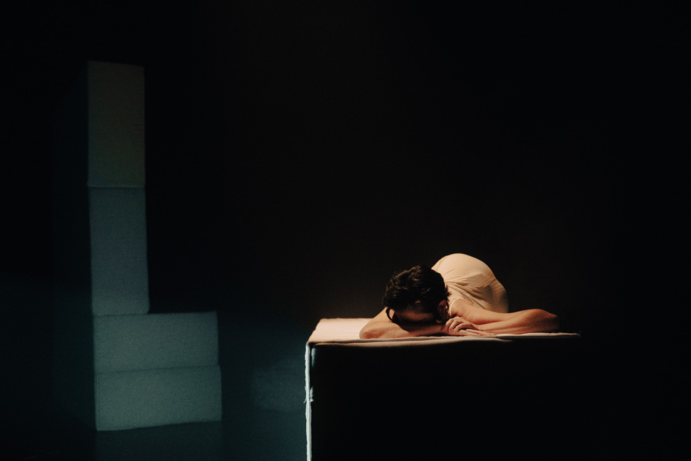 De fet el personatge protagonista de l’obra, que encarna amb una refinada i exquisida actuació Laura Vila Kremer, es presenta en escena reproduint una de les imatges més coneguda del mite, l’escultura d’Hermafrodita dorment que es troba en el Louvre, còpia romana del segle II a.C d’un original hel·lenístic del s.II a.C, restaurada el 1619 per David Larique. Sense el llit de marbre, però si sobre una superfície flonja i blanca, com ho són els diferents elements escenogràfics de l’obra. Sense la nuesa del marbre, però amb un vestit lleuger que modela el seu cos esvelt, proveït de la bellesa arcaica que dona l’ambigüitat. És a dir, l’actor-actriu encarnant una figura doble i mitològica, que alhora ens parla amb el llenguatge de la nostra època per explicar-nos les crues misèries que envolten el mite quan aquest baixa dels núvols i esdevé realitat: l’estranyesa de tots els que l’envolten, el silenci que s’imposa a la seva condició ambigua, la sensació de ser un monstre que s’ha d’amagar, la condemna a una vida d’ocultament i d’automarginació, la incomprensió dels amics i de la família, i el buit de no tenir una identitat nítida i clara sobre la que recolzar-se.
