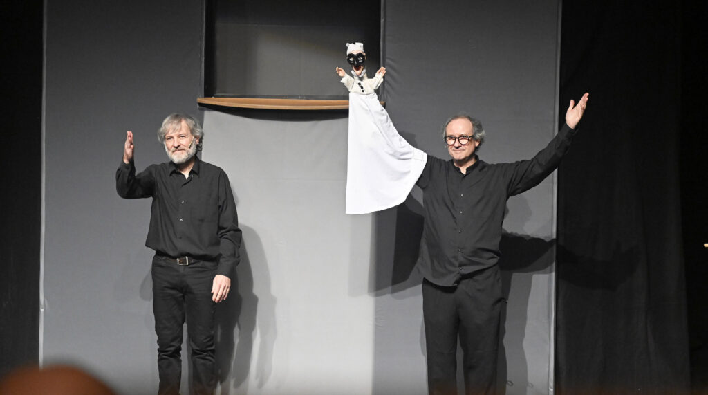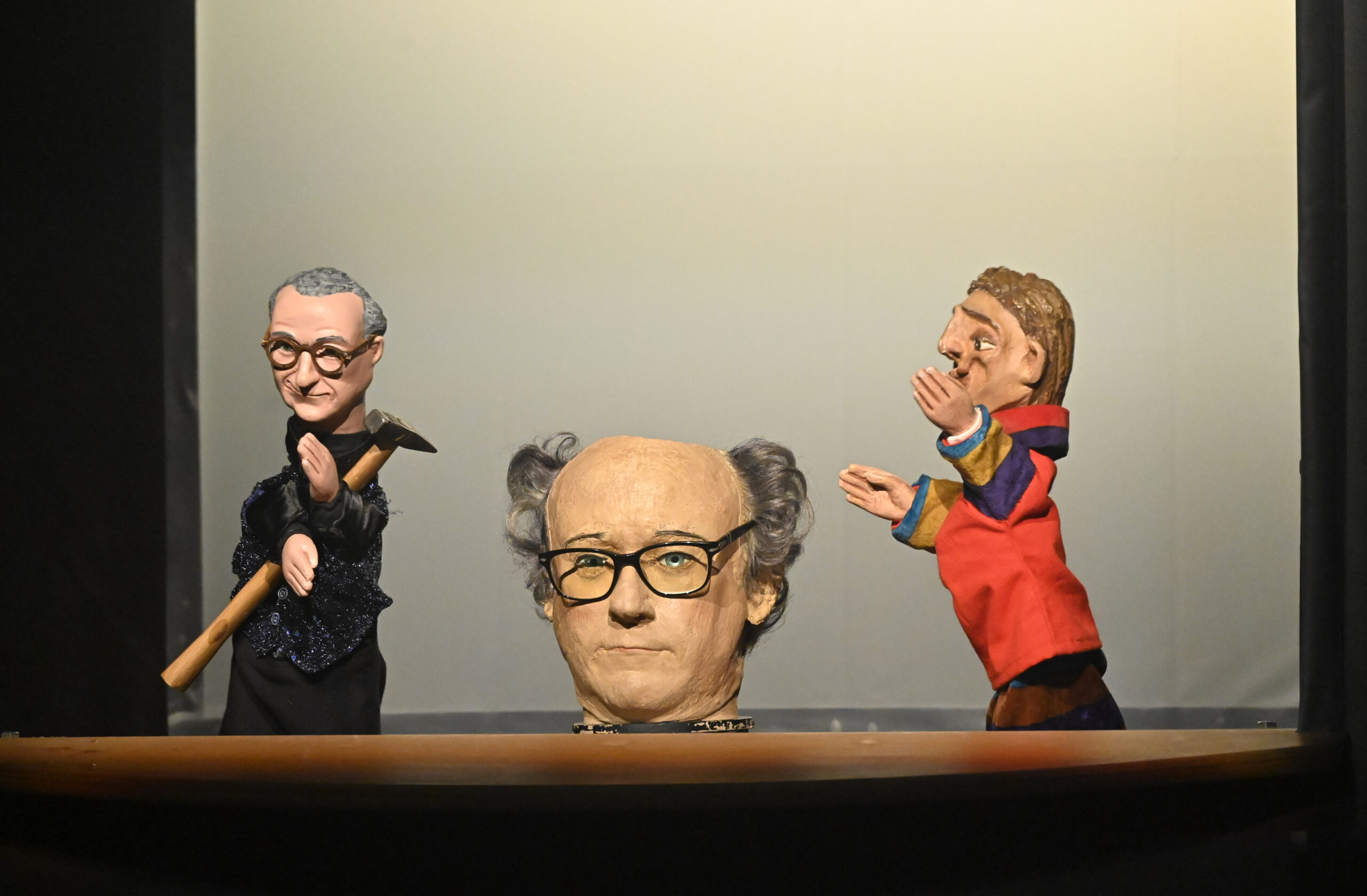… A través de su conferencia y de una brillante secuencia de teatro de sombras, el titiritero parlanchín nos va revelando todos estos secretos mientras nos muestra las caras dobles y ocultas de estas criaturas llamadas marionetas. Sin mencionarlos, el autor juega con unos espejos invisibles que se dejan intuir si aplicamos una mirada oblicua a lo que vemos en el escenario. De entrada, los dos títeres que son sus dobles, puros espejos que podríamos llamar de la alteridad: reflejos del titiritero con vida propia. Lo cuestionan o incluso se alían entre sí para torearlo y darle una estocada que, lejos de matarlo, salva al titiritero de su desastre.