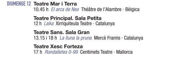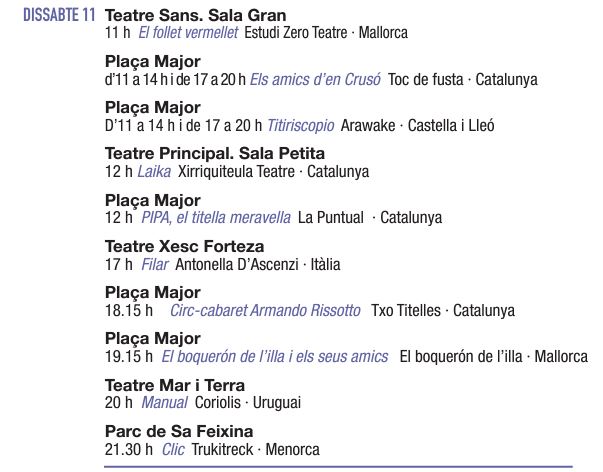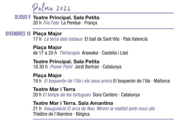 Ja es coneix el programa del 26è Festival Internacional de Teresetes 2024 de Mallorca, que aquest any es celebra la segona setmana de maig de 2023, del 6 al 12, amb una munió d’espectacles i d’activitats diverses plens d’interès i de mola qualitat. Són 19 espectacles, a més d’instal·lacions, exposicions, jocs i tallers, de la mà de 20 companyies provinents de Bèlgica, França, Italia, Uruguai, Catalunya, Castella i Lleó, País Valencià i les Illes Balears.