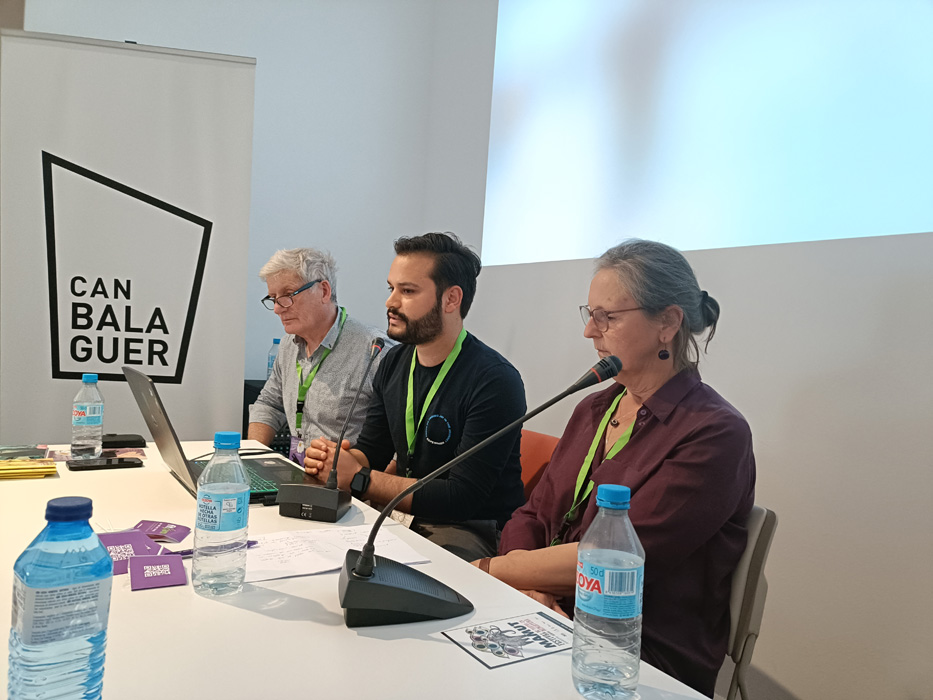 Intervenció de Pedro Carvalho. D’esquerra a dreta, Helen Lannagan, Pedro Carvalho, Roberta Colombo i Rosa Encinas