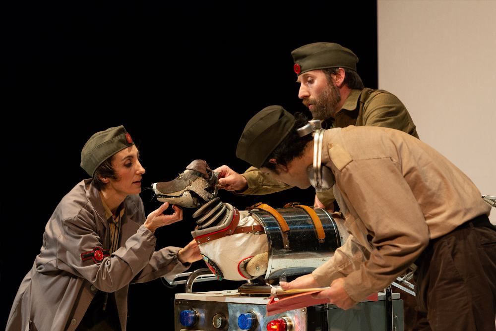 Però l’important aquí és el joc dels actors en el registre de comèdia crítica i burlesca de la proposta, els quals broden amb una interpretació exquisida, amb un gos interpretat per un titella que sembla que tingui vida real, i uns personatges sortits de la màquina del temps, que parlen una llengua inventada que sona realment a rus, amb unes aptituds formidables per a la paròdia i la caricatura.