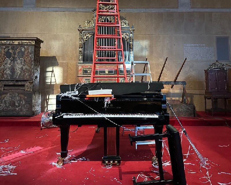 (El piano de ‘Escabetxina escabetxada’, intervenció de Jordi Oriol i Carles Pedragosa, tal com va quedar després de l’acte inaugural de l’exposició ‘Rastres de Carles Santos’, al Museu de la Música. Foto Museu de la Música)