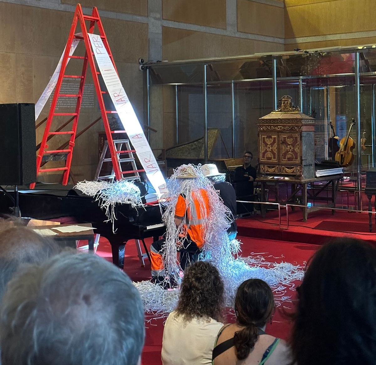 Jordi Oriol i Carles Pedragosa en plena intervenció, coberts per la llarga partitura triturada que surt de la màquina trituradora mentre toquen la peça de Santos. Foto Museu de la Música