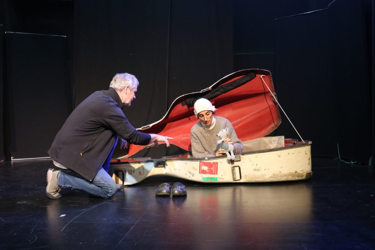 L’escenografia, que s’ha focalitzat en una impressionant funda de contrabaix, l’instrument que la dona va aprendre a tocar i del qual ha viscut en la seva època activa, és una de les millors troballes de l’espectacle. És el lloc on ella viu d’una manera itinerant quan s’ha quedat sense casa, però és també moltes altres coses. De fet, veiem aquesta funda al seu costat des de que era nena, i en tots els diferents moments de la seva vida. I la gràcia de la proposta és que converteix la funda en un símbol, en aquesta ‘llar’ invisible que tots ens construïm, i que guarda les ressonàncies vitals d’una pulsació, que és la del contrabaix però també la del cor que batega i ens dona vida, el real i el simbòlic que tots tenim a dintre.