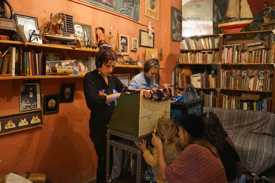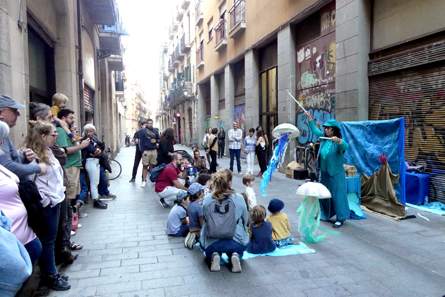 Els següents títols per a infants es van fer a l’exterior, a l’entrada del Taller, un total encert en crear-se una preciosa atmosfera poètica i de festa alhora. L’encarregada de posar la poesia al carrer va ser Eva Navarro, de Clancarakol, una veterana del Taller que amb el seu espectacle Bajo el mar, va aconseguir casi bé un impossible: crear un clima màgic al carrer Guàrdia, amb uns titelles de fil i de mà que representaven peixos, pops, crancs i altres animals de mar.