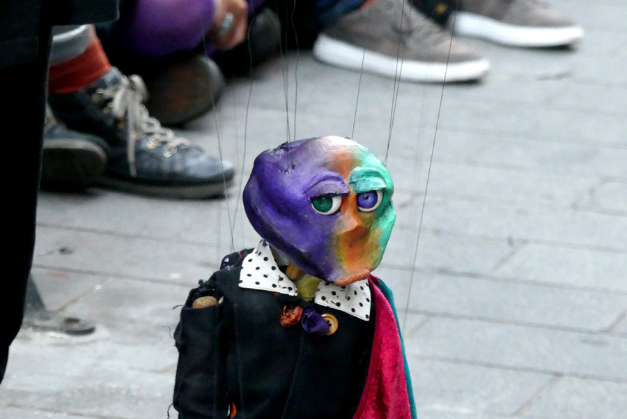 Va començar Helena de Sola, de la Cia. La Sola, amb Equilibris, un espectacle que en realitat són fragments de diverses obres de l’Helena, com el seu conegut Circoland. Una barreja de cabaret i teatre d’objectes, híbrid i varetes, amb moments de gran subtilesa, i que conclou amb el titella que ha de passar la maroma fent equilibris amb tres manipuladors eixits del públic. Estant aquest compost per molts titellaires, s’entén que l’exercici circense de l’artista de fil s’hagi efectuat amb molta destresa i sense caigudes inesperades.