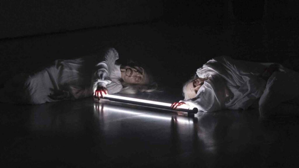 Dos titelles vestits de blanc, de llarguíssims cabells blancs i uns rostres esculpits per les arrugues de l’ancianitat que venen a representar una pertorbadora simbologia de la mort. Una mort que volem “ignorar” però que sabem és ineludible…