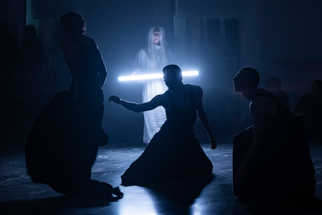Els ballarins-actors en contrallum i vestits de negre luctuós. Darrera, la ballarina-actriu, tan blanca i fantasmal com la mort. Foto: Lorenza Daverio. Teatre LLiure-La Veronal