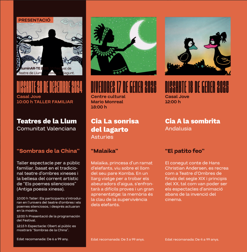 Il·luminar-te, el Festival de Teatre de Llum i Ombres de Sagunt, arriba a la seva 10a edició amb un programa que va del 17 al 26 de gener del 2025. La gran novetat és que ha comptat amb dues seus: el Centre Cultural Mario Monreal i el Casal Jove de Port de Sagunt, amb un total de 12 representacions.