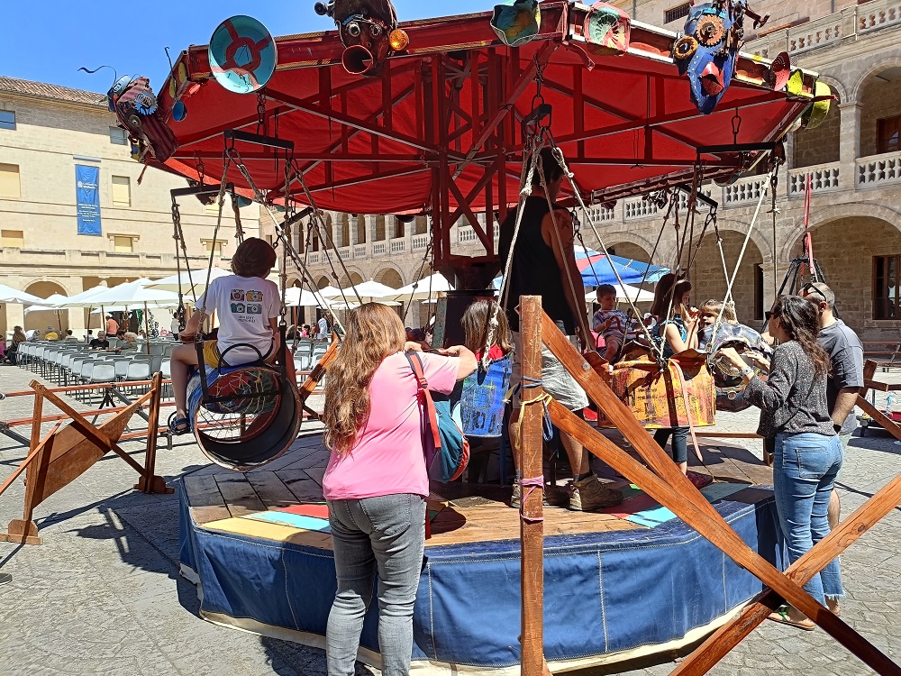 Per exemple, la instal·lació El Ball del Metall, plena de joc i d’atraccions fets amb materials descartats, com bidons, olles i ferros, instal·lacions lúdiques plenes de creativitat i diversió per a tota la família. La feina dels seus responsables, Lila Jocs Reciclats i Circ, combina enginy, reciclatge i joc per a donar vida a aparells que fomenten la destresa, l’habilitat i la imaginació de persones de totes les edats. Dos carrusels, una balança gegant giratòria i molts de jocs. Una recepta lúdica que va entretenir a les famílies que acudiren al Pati de la Misericòria, mentre esperaven l’hora de les representacions que també s’hi feien.