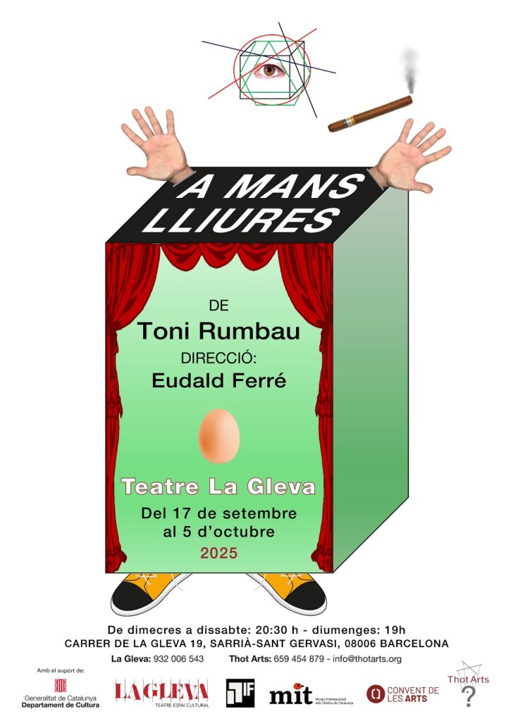 Cartell dissenyat per Toni Rumbau i Francesc Villena per a l’espectacle: “A mans lliures”, de Toni Rumbau. Direcció Eudald Ferré. En els inicis de la temporada 2025-2026, formarà part, entre el 17 de setembre i el 5 d’octubre, de la programació del Teatre La Gleva de Barcelona.