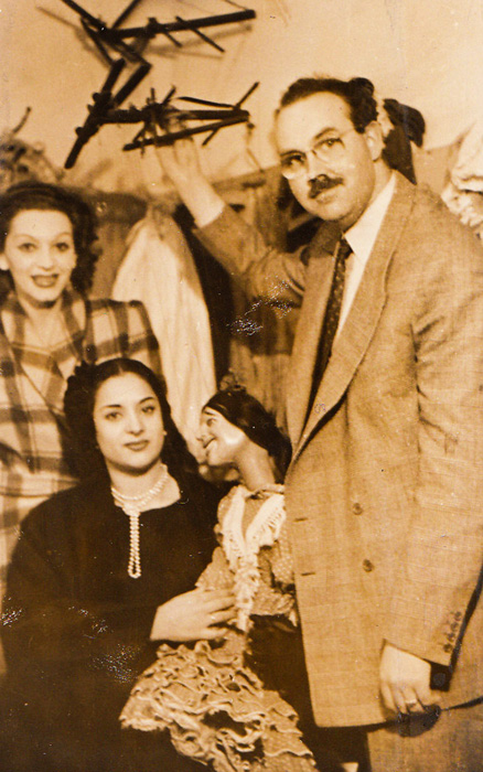 Lluís Fontanet junt amb Herta Frankel al fons i Lola Flores, amb la marioneta que la representa. Fons fotogràfic del Marionetàrium Herta Frankel