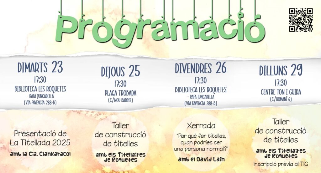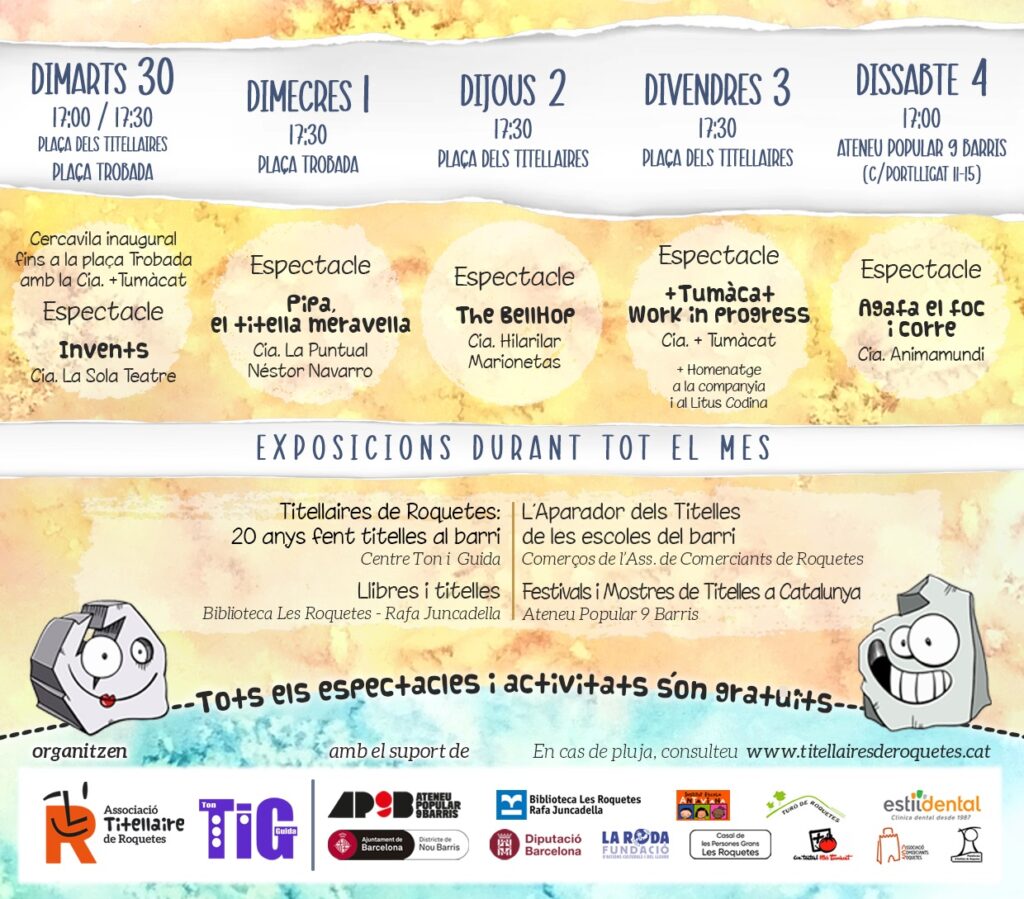 Del 23 de setembre al 4 d’octubre té lloc la cita anual de La Titellada 2025, la Mostra de Titelles de Les Roquetes (Nou Barris – Barcelona) que organitza l’activa Associació Titellaire de Roquetes. Un esdeveniment dels més entranyables dels que es realitzen a Barcelona, que sempre intenta recolzar i homenatjar a la professió titellaire local però també de fora, segons les possibilitats de cada any.