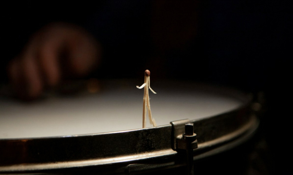 Aquesta escena de “A mans lliures”, amb absència de figures morfològiques o antropomòrfiques, ens remet a un moment de l’espectacle on el teatre de titelles conviu amb el teatre d’objectes. Foto: Arxiu putxinelli.cat